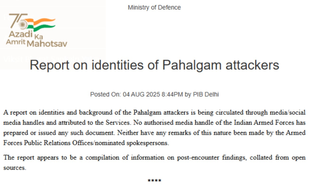 जारी बयान में कहा गया, “पहलगाम हमलावरों की पहचान और पृष्ठभूमि पर जो जानकारी प्रसारित की जा रही है, वह किसी भी अधिकृत सैन्य मीडिया हैंडल द्वारा जारी नहीं की गई है।”